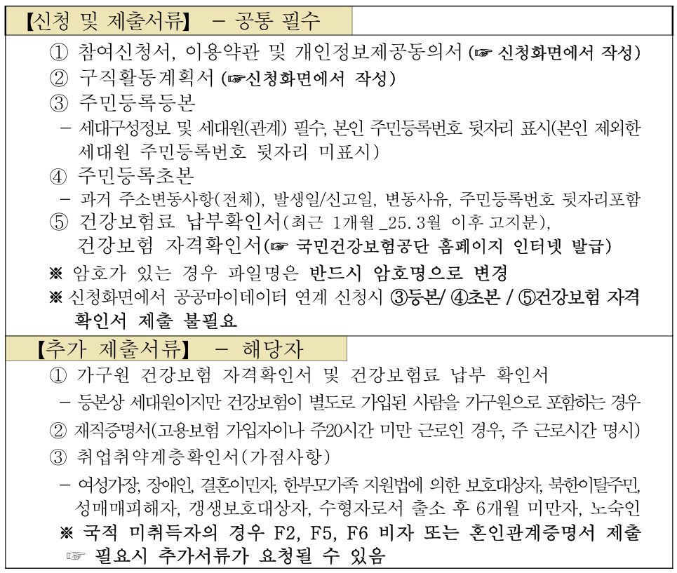 ※본인이 희망할 시 등본에 등제된 부모 · 형제자매에 한하여 가구원 수로 포함하는 것이 가능하며, 포함된 세대원의 건강보험 자격확인서 및 건강보험료 납부확인서를 추가로 제출하여야 함