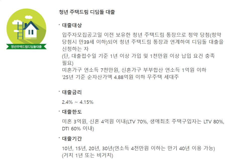 □ 청년 주택드림 통장 청약 당첨자입주자모집공고일 이전 보유한 청년 주택드림 통장으로 청약 당첨(당첨 시 만 39세 이하)되어 분양계약을 체결하고,아래 조건을 모두 충족하여 청년 주택드림 통장과 연계하여 디딤돌 대출을 신청하는 자(상속, 증여, 재산분할로 주택을 취득하는 경우 불가)
