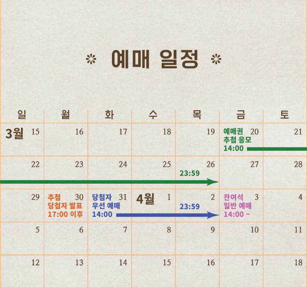 | 당첨자 우선 예매 | 3/31(화) 14:00 ~ 4/02(목) 23:59 | 날짜 및 좌석 선택 (결제) |