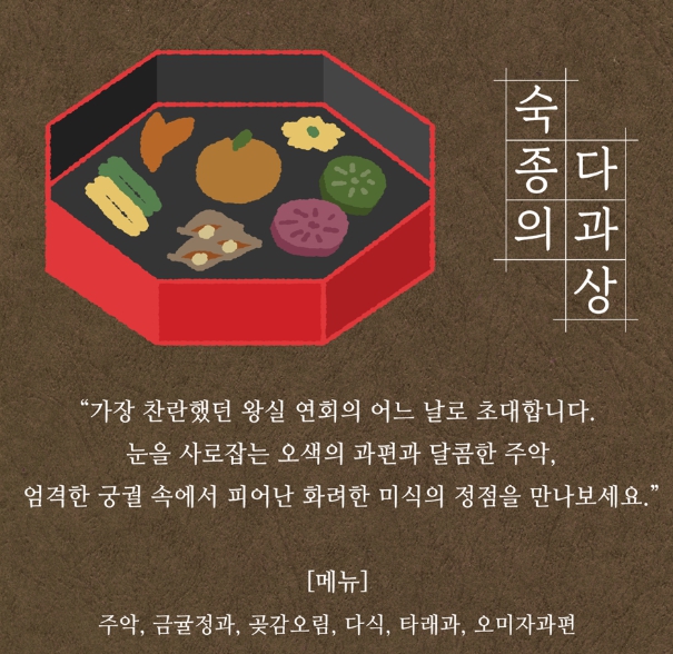 - [숙종의 다과상]: 주약, 금귤정과, 오미자과편 등 화려하고 달콤한 맛이 특징입니다.
