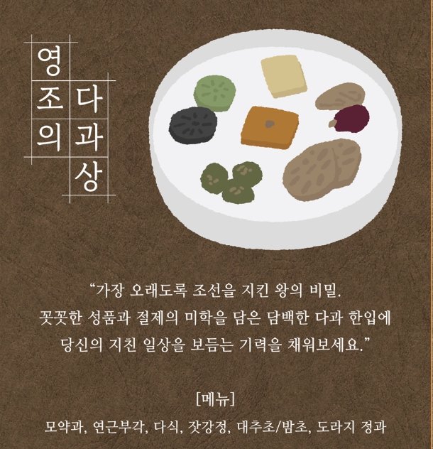 - [영조의 다과상]: 모약과, 연근부각, 다식 등으로 구성된 담백하고 건강한 맛입니다.