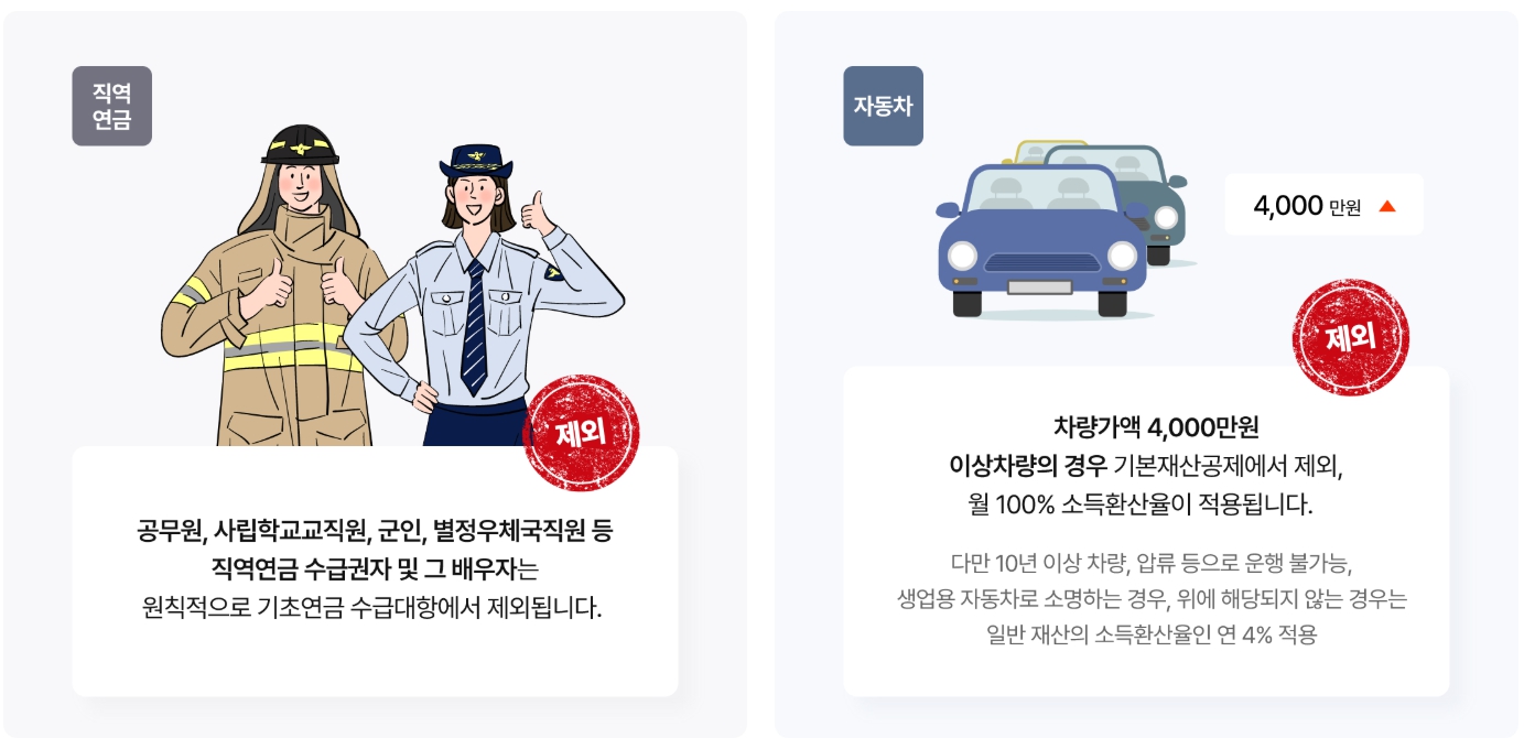 공무원·군인·사학·별정우체국 연금 수급자 및 그 배우자는 원칙적으로 제외되지만, 예외가 있습니다.