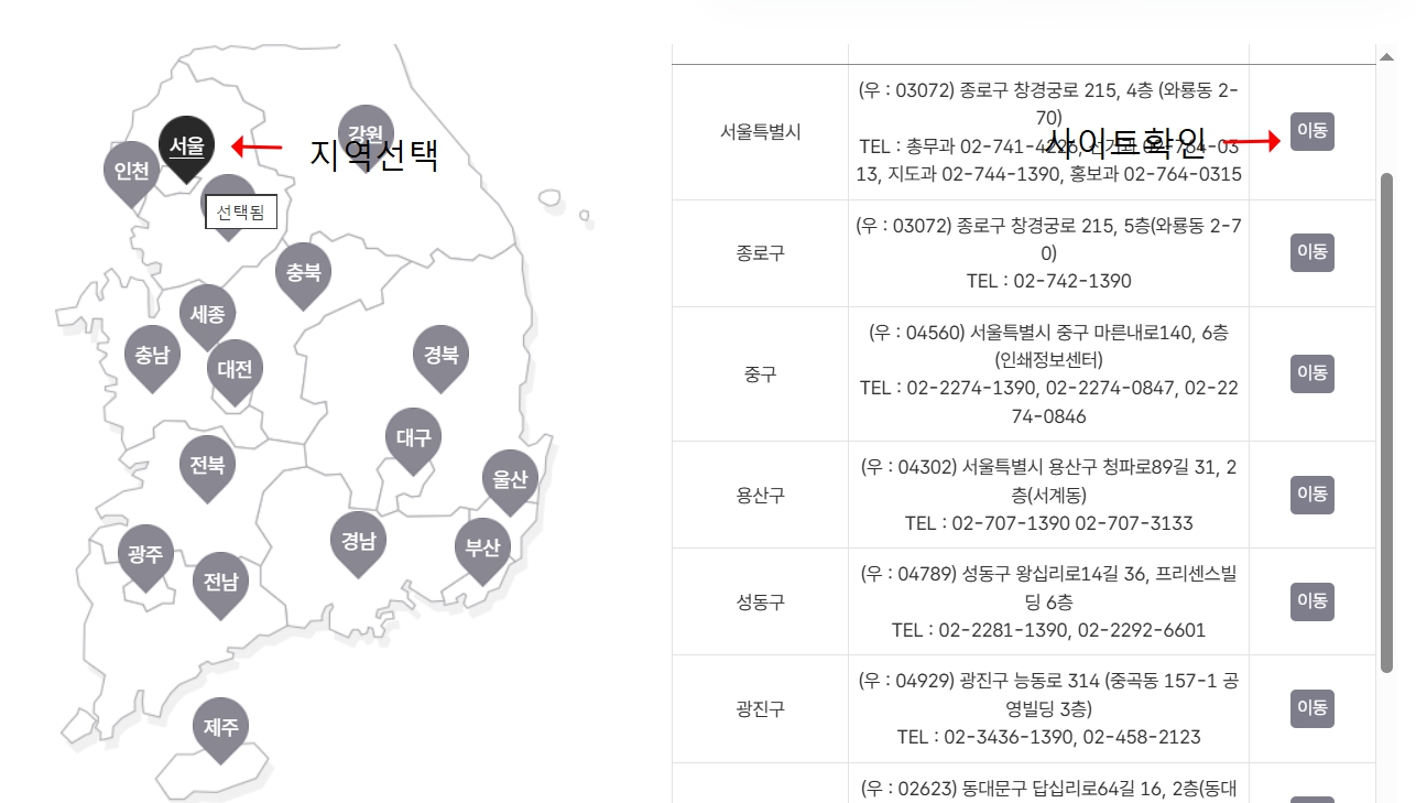2. 지도에서 본인의 거주 지역을 선택하면 우측에 해당 구·시·군 위원회 공고가 뜹니다