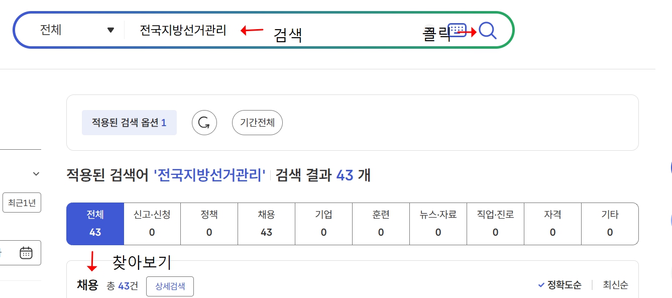 - 고용24 검색창에 '지방선거관리' 또는 **'선거사무원'**을 입력하세요.