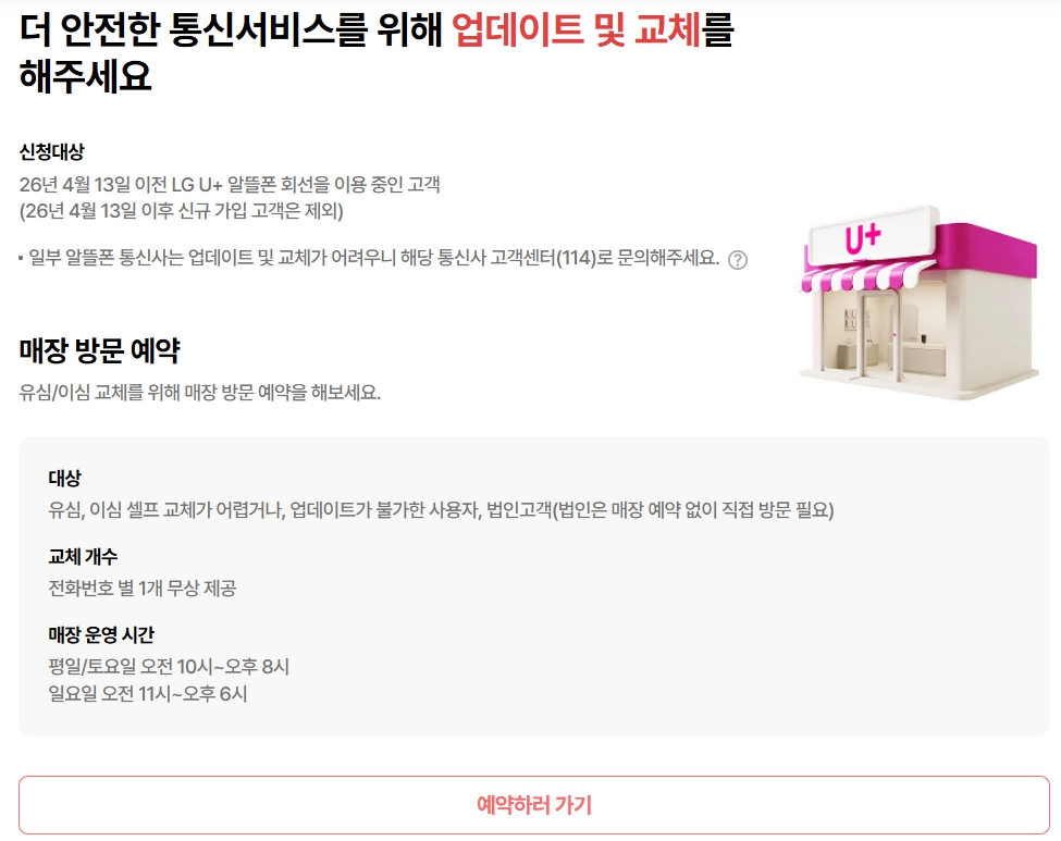 하지만 보안 강화를 위해 기존 유심을 **'업데이트'**하거나 **'새 유심으로 무상 교체'**하는 과정은 필수입니다. 오늘부터 시작되는 무상 교체 예약 방법과 대상을 1분 만에 확인하실 수 있도록 핵심만 정리했습니다.