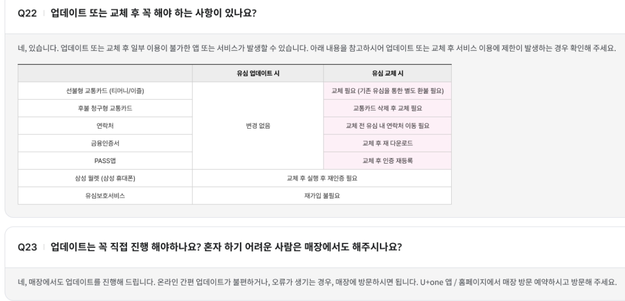 - 유심 업데이트: 대부분의 최신 유심 사용자 해당. 매일 오전 8시 ~ 오후 10시 사이에만 온라인([U+one] 앱)에서 5분 만에 완료 가능.