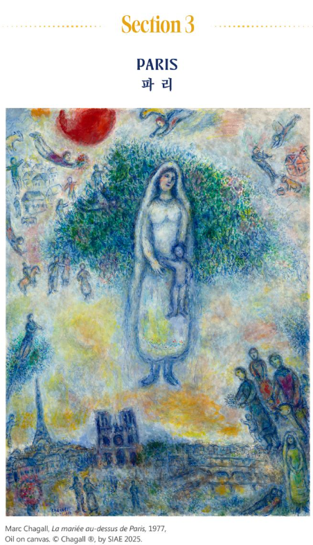 화가로서의 꿈을 이루게 해 준 도시 파리를 다시 그리기 시작했습니다. 샤갈에게는 파리는 단순한 묘사의 대상이 아니었습니다. 그는 파리를 내면의 세계로 흡수하고, 자신만의 독특한 화풍을 통해 새롭게 창조해 냈습니다. 예술을 통해 도시를 소유하고자 했던 선대의 화가들과 같이, 샤갈 역시 연인들, 동물들, 그리고 자신만의 상징들로 파리를 가득 채웠습니다.