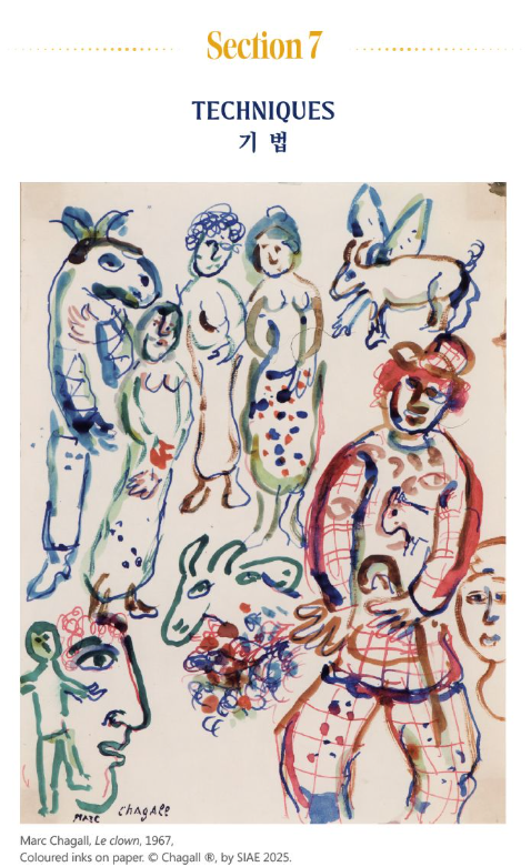 이번 전시의 <기법> 섹션에서는 표면의 질감에 따라 다르게 드러나는 샤갈의 색채를 경험하며, 부드럽고 거칠고 유연한 재료