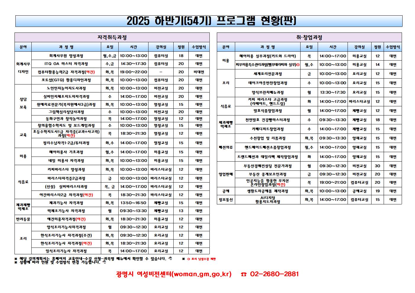 광명시 여성비전센터에서 2025년 하반기 정규과정(제54기) 수강생을 모집합니다.