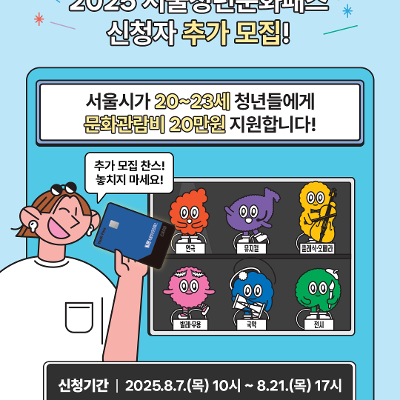 서울특별시가 주관하는 **‘서울청년문화패스’**는 **서울에 거주하는 청년(20~23세)**을 대상으로 연간 **20만 원 상당의 문화이용권(카드)**을 지원하여, 연극·뮤지컬·전시 등 다양한 문화예술 콘텐츠를 보다 쉽게 접할 수 있도록 돕는 청년문화 지원 사업입니다.