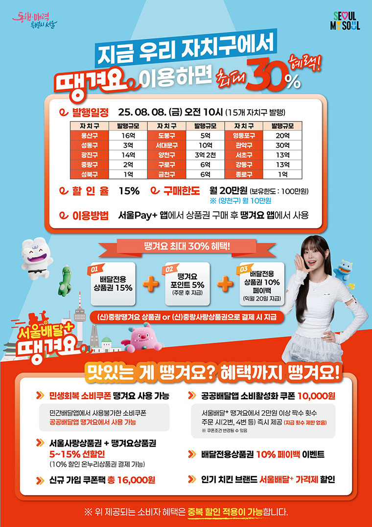 2025년 8월 8일부터 서울의 15개 자치구에서 ‘배달전용상품권’이 15% 할인된 가격으로 발행됩니다.