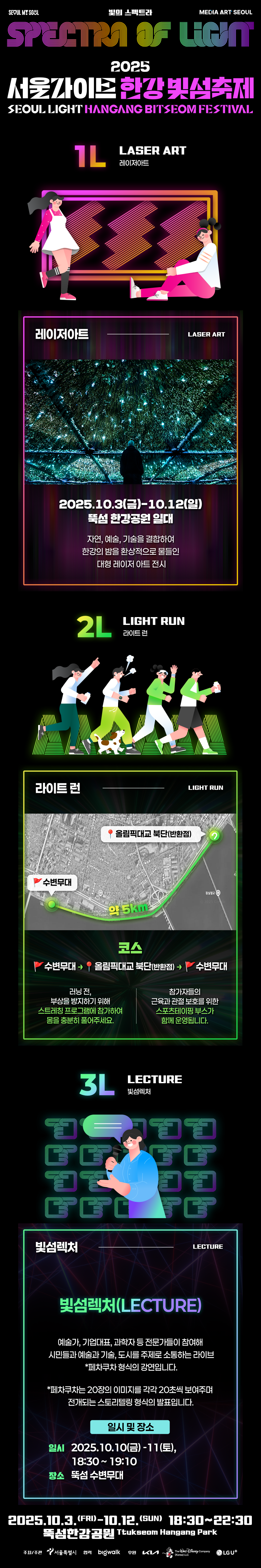 자연, 예술, 기술이 조화를 이루는 수변 레이저·미디어아트를 전시한다. **‘빛의 스펙트라(Spectra of Light)’**를 주제로, 세계적 수준의 미디어아트가 뚝섬 한강변을 빛으로 물들인다 - 라이트 런 (Light Run)