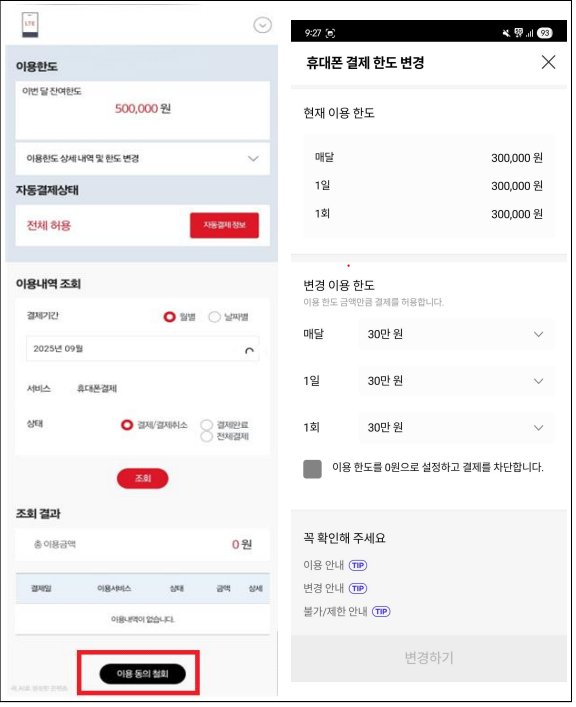 당신의 U+ > 마이페이지 > 휴대폰 결제 > 결제 한도 변경