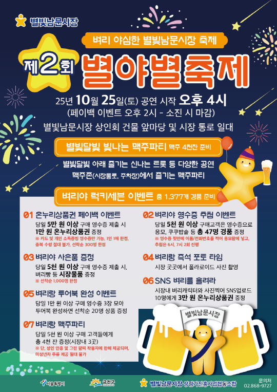 서울시 문화분야 종합 정보 제공 사이트 서울문화포털, 벼리 야심한 별빛남문시장 가을밤 야시장 맥주축제 [제2회 별야별축제], 2025-10-25~2025-10-25, 별빛남문시장 주차장 및 시장 통로 일대, 무료