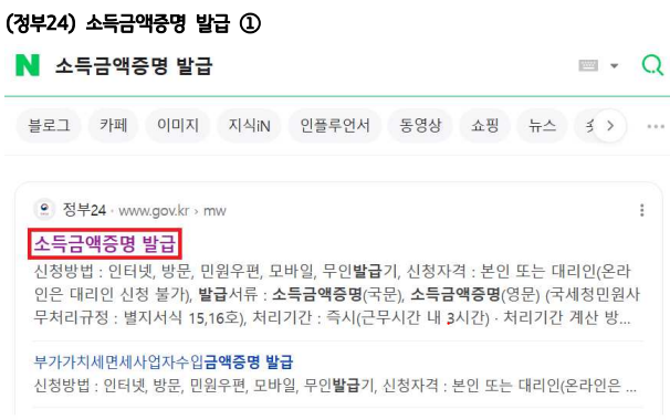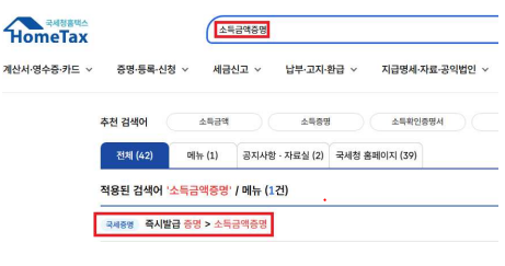 - 검색창에 “소득금액증명” 입력 → “발급신청” 선택