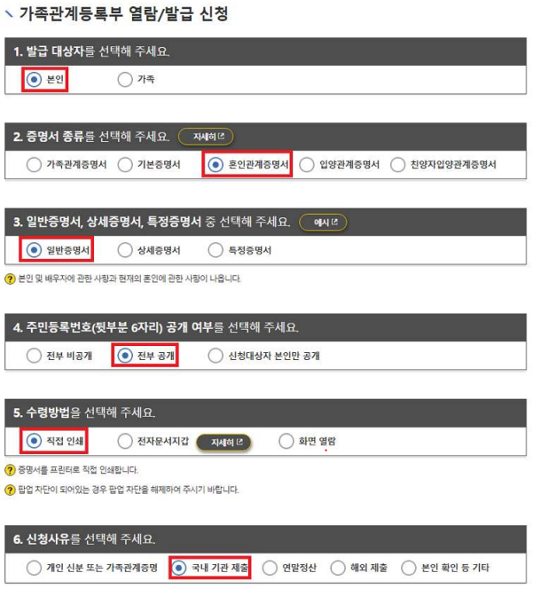 - 발급유형: “본인 → 혼인관계증명서 → 일반 → 전부공개” 선택