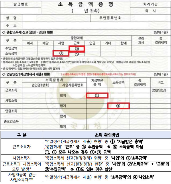 (※ ‘소득금액’ 항목이 아니라 지급받은 총액 또는 수입금액 항목을 기준으로 함)