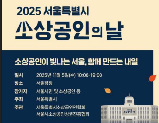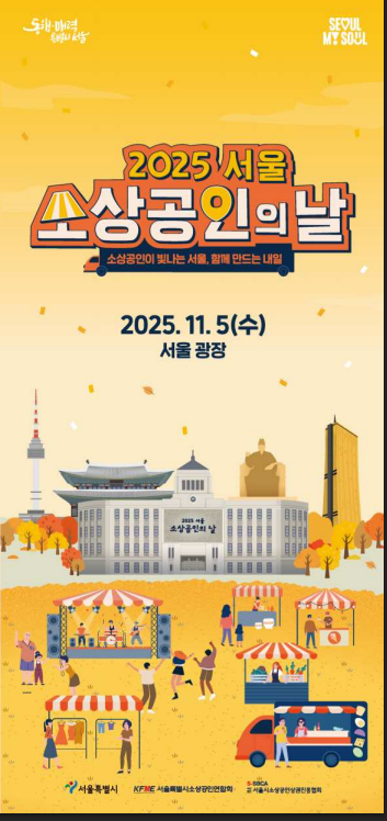 **‘2025 서울소상공인의 날’**이 오는 11월 5일(수) 오전 10시부터 오후 7시까지 서울광장에서 개최됩니다.