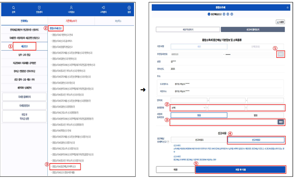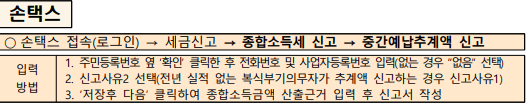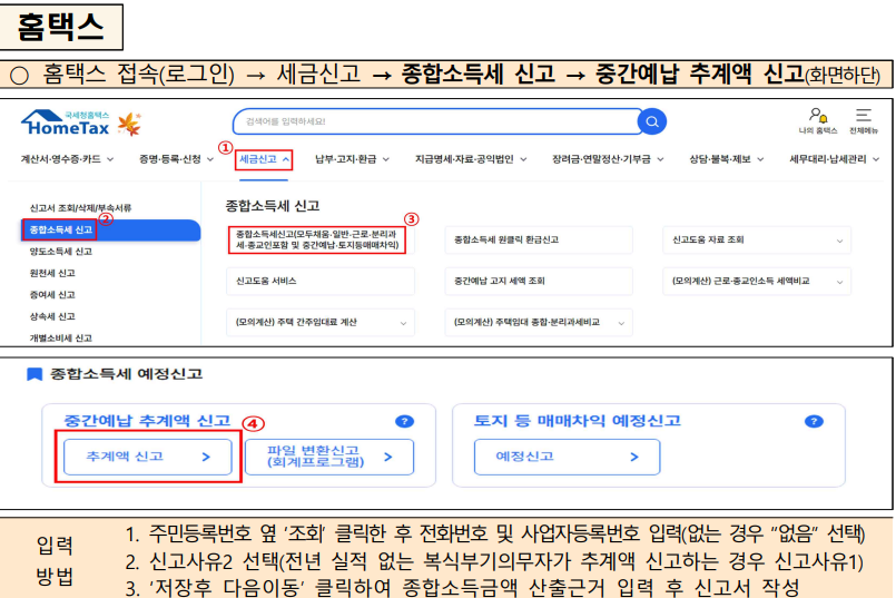 2️⃣ [신고/납부] → [종합소득세] → [중간예납] 메뉴 클릭
