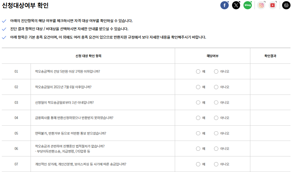 신청대상 여부 확인 – 착오송금수취인 기준