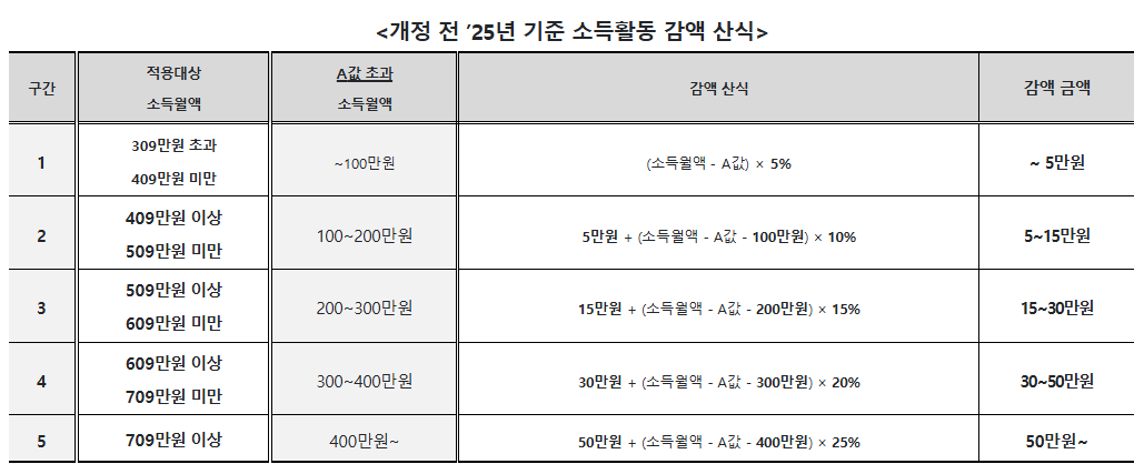 기존 국민연금 제도에서는 연금 수급자가 소득활동을 하여 **국민연금 전체 가입자의 평균소득(A값)**을 초과할 경우, 초과 금액에 따라 연금이 감액되었습니다.
