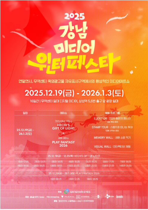 연말의 따뜻함과 새해의 희망을 동시에 담은 2025 강남 미디어 윈터페스타는 겨울철 강남을 대표하는 미디어아트 축제로, 크리스마스와 새해를 특별하게 보내고 싶은 이들에게 의미 있는 시간이 될 것이다.