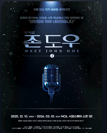 익명의 이름 ‘존 도우’를 통해 절망의 시대를 흔드는 거짓과 진실, 그리고 인간의 목소리를 그린 이 작품은 강렬한 메시지와 음악으로 꾸준히 회자되어 온 뮤지컬이다.