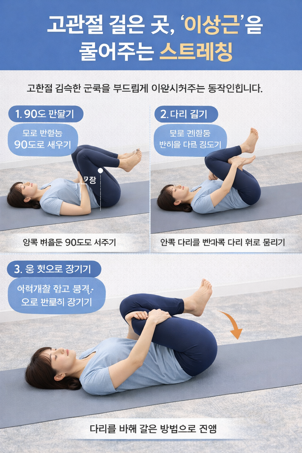 이 동작은 고관절과 허리 주변 긴장을 함께 풀어주는 데 도움이 됩니다.