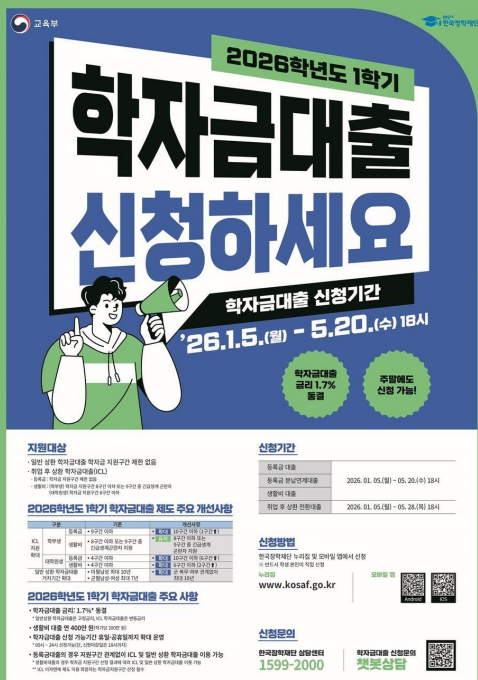2026학년도 1학기 학자금대출 신청이 1월 5일부터 시작됩니다.